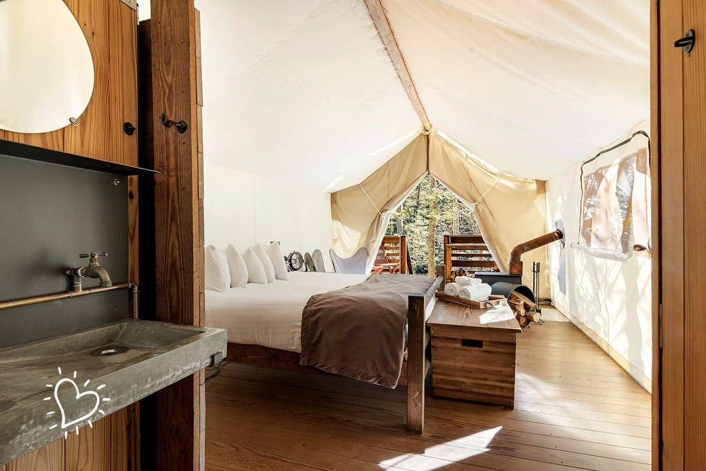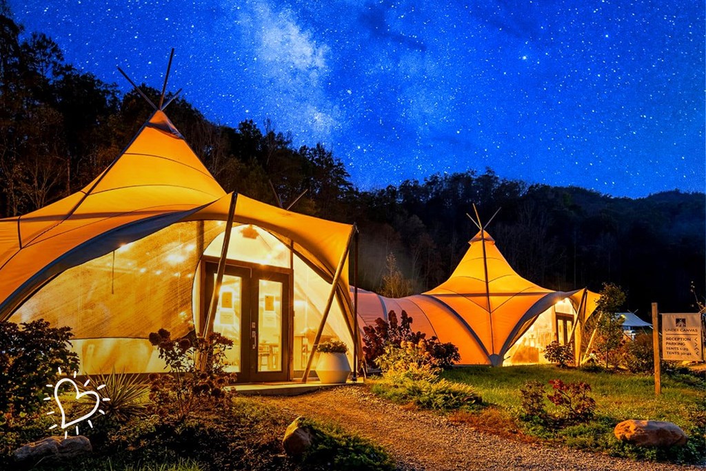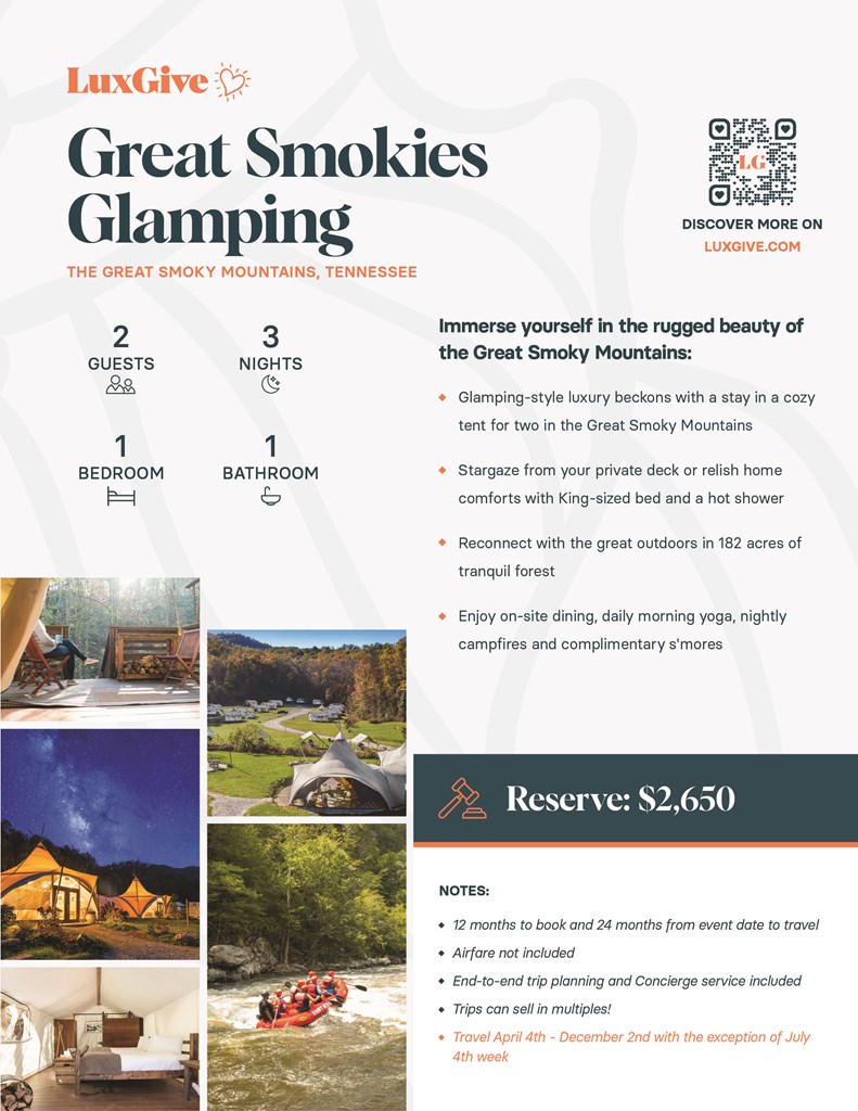 Your Great Smoky Mountain experience includes 3 nights for 2 guests in a luxury glamping tent in the heart of nature. Reconnect with the great outdoors in 182 acres of tranquil forest Relish home comforts with a King-sized bed, hot shower/sink, and flushing toilet. Stargaze from your private deck with lounging chairs, wood-burning stove, and firewood included. Enjoy daily morning yoga, nightly campfires, and complimentary s'mores. Savor on-site dining with locally-sourced, seasonal meals. Discover Great Smoky Mountains National Park and Gatlinburg 20 minutes away. Benefit from dedicated concierge service and end-to-end travel planning.